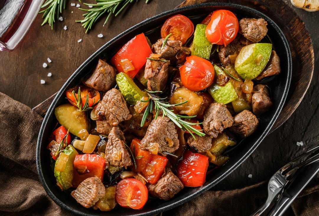 Говядина, картофель, помидор, перец, баклажан, лук