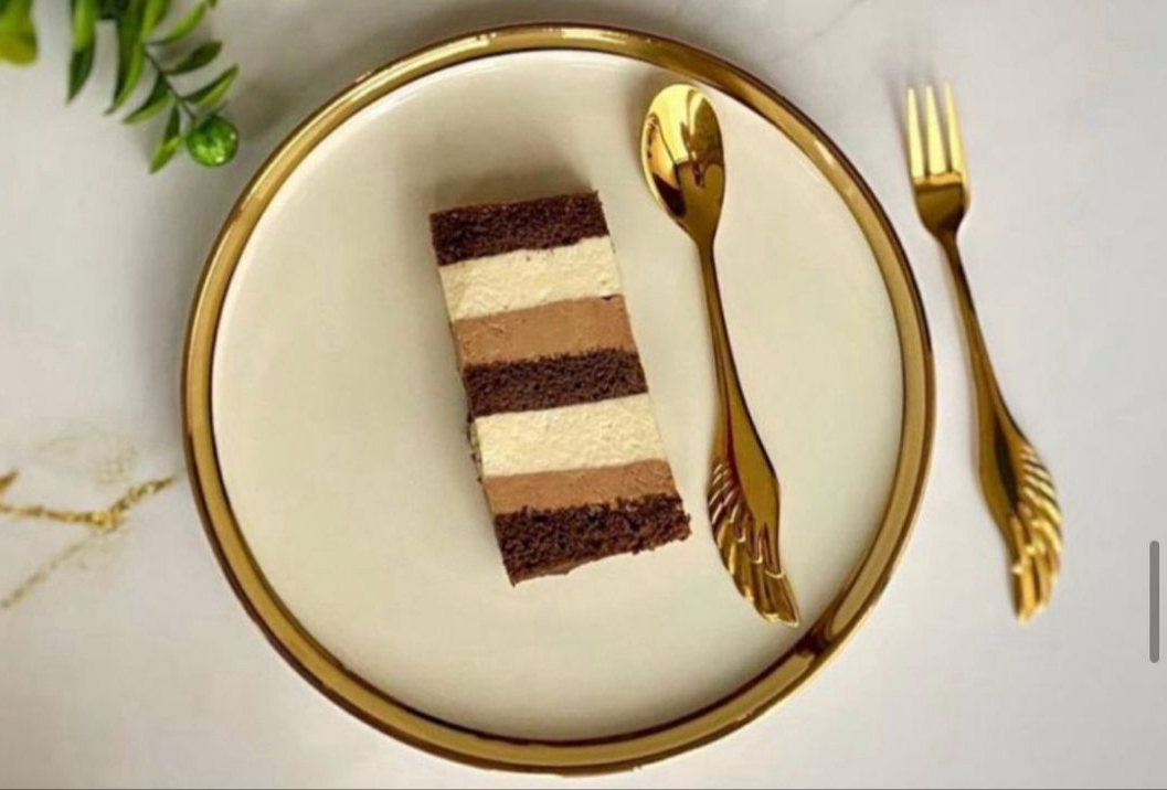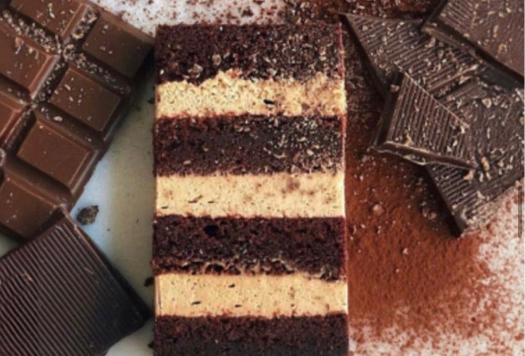 Насыщенный шоколадный бисквит с прослойками из сливочного и шоколадных мусссов с небольшой кислинкой.